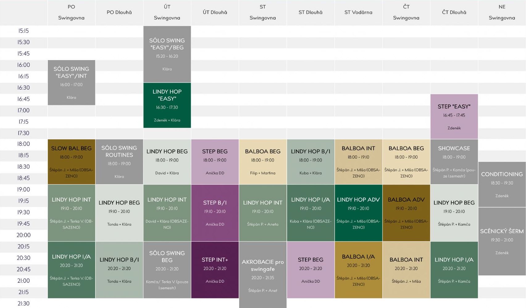 | PO Swingovna | PO Dlouhá | ÚT Swingovna | ÚT Dlouhá | ST Swingovna | ST Dlouhá | ST Vodárna | ČT Swingovna | ČT Dlouhá | NE Swingovna | |