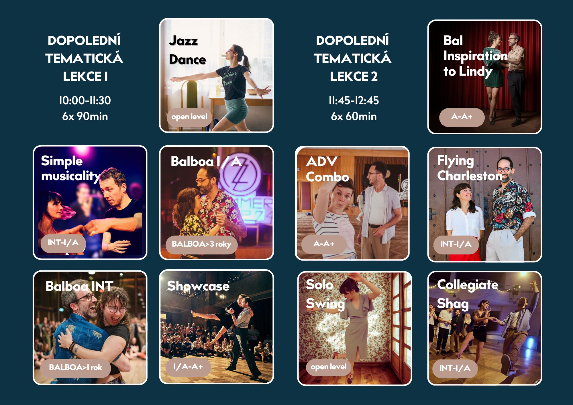 Hlavní lekce jsou zaměřeny na Lindy Hop. Vyberete si level podle popisu a svých tanečních zkušeností (s Lindy Hopem) níže.