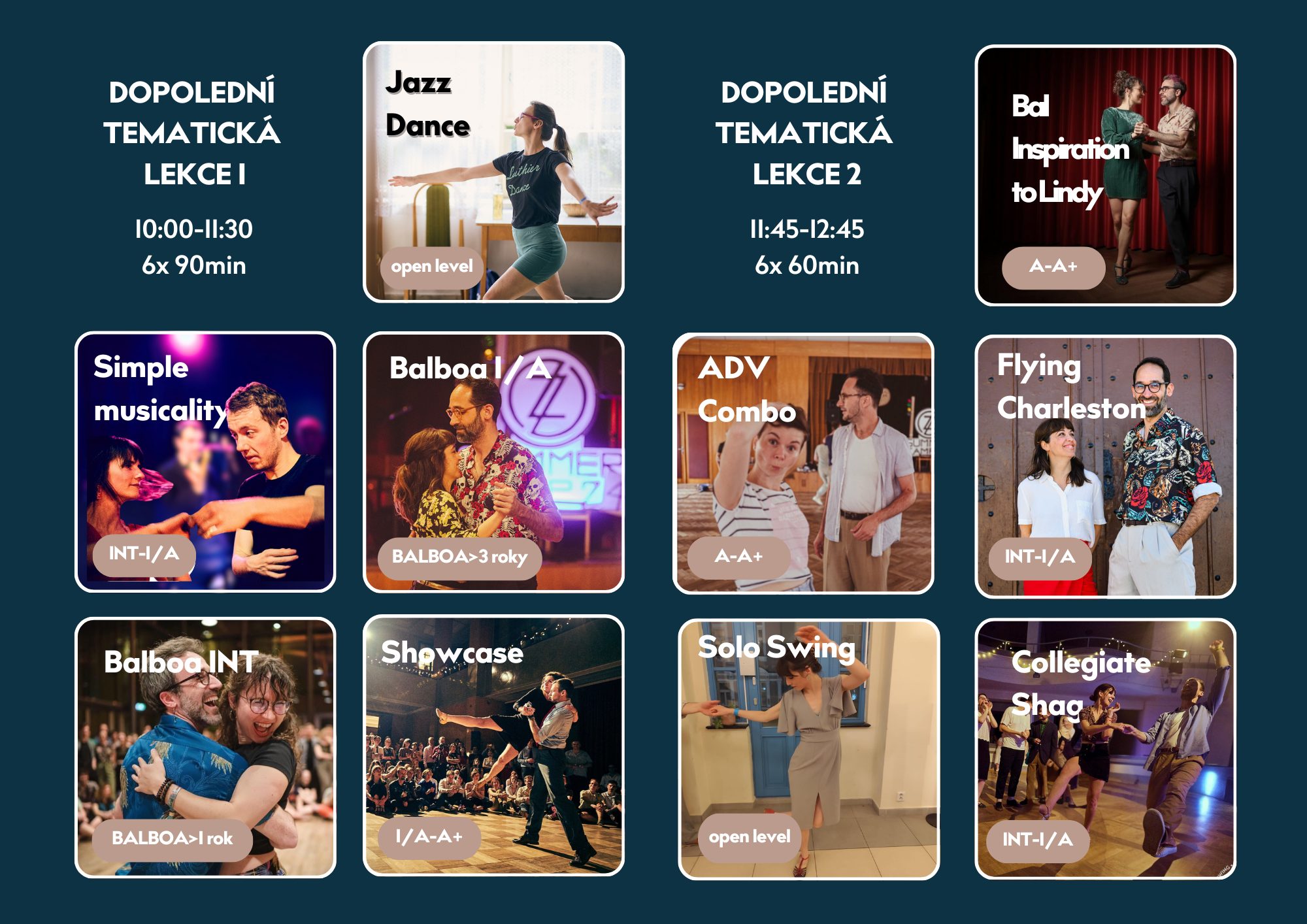 Jedná se o různá témata, která se do běžných lekcí nevejdou. Při registraci v páru na hlavní lekce si může každý z páru vybrat jiné tematické lekce. U párových lekcí budeme vždy místa potvrzovat podle aktuálního počtu leaderů a followerů.